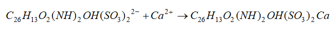 按Wiff發(fā)色基團(tuán)學(xué)說(shuō),染料的顏色取決于其分子結(jié)構(gòu)。醌式環(huán)是酸性媒染藍(lán)黑B染料的發(fā)色基團(tuán),分子中—OH、—SO3H是酸性助色團(tuán),分子中—NHR是堿性助色團(tuán),該染料分子結(jié)構(gòu)中共軛鏈很長(zhǎng)、加上苯環(huán)數(shù)量達(dá)5個(gè)之多、分子量大(518.8), 特別是助色基團(tuán)多,顏色得以加深。該酸性染料易溶于水,碳酸鈣漿液中游離的Ca2+與染色劑分子之間發(fā)生如下反應(yīng):