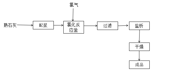 在開車時,將氫氧化鈣(熟石灰),配制成濃度小于25%的漿液加入反應(yīng)釜中,通入氯氣進行反應(yīng),控制反應(yīng)溫度低于50℃,以pH值控制反應(yīng)過程,終點為pH=10-11,停止通氯,漿液攪拌待出。