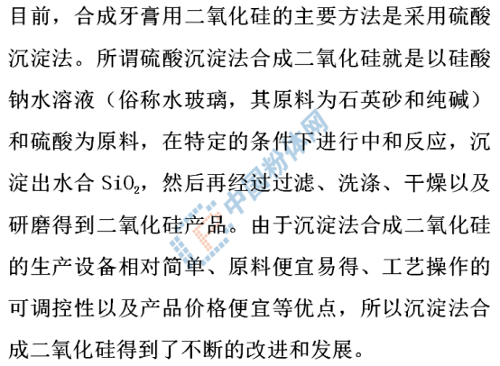 二氧化硅類牙膏磨擦劑是近些年來發(fā)展最為迅猛的一類高檔牙膏磨擦劑。二氧化硅作為高檔牙膏磨擦劑具有其獨特的優(yōu)勢。二氧化硅(SiO2)通常是通過沉淀法合成的,所以又稱作水合二氧化硅或者是無定形二氧化硅,它的化學式為SiO2•nH2O。