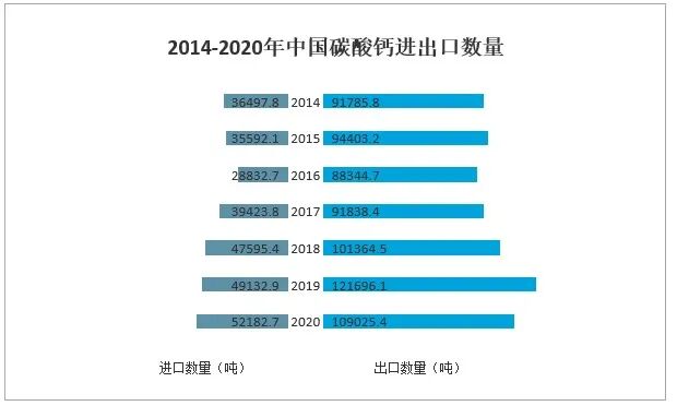 中國(guó)是世界上石灰?guī)r礦資源豐富的國(guó)家之一。除上海、香港、澳門(mén)外,在各省、直轄市、自治區(qū)均有分布。所以也是碳酸鈣出口主要國(guó)家之一,其中2020年中國(guó)碳酸鈣進(jìn)口數(shù)量為52182.7噸,同比增長(zhǎng)6.2%;受疫情影響,碳酸鈣出口有所下降為109025.4噸,同比下降10.4%。