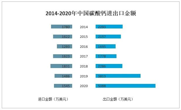 據(jù)中國(guó)海關(guān)數(shù)據(jù),2020年中國(guó)碳酸鈣進(jìn)口金額為1545萬(wàn)美元,同比增長(zhǎng)3.9%;中國(guó)碳酸鈣出口金額為5088萬(wàn)美元,同比增長(zhǎng)33.5%。