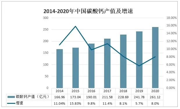 國(guó)內(nèi)碳酸鈣行業(yè)產(chǎn)值快速增長(zhǎng),2020年中國(guó)碳酸鈣產(chǎn)值為261.12億元,同比增長(zhǎng)8%。