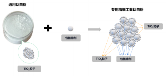 再者,針對(duì)研發(fā)、滿足需求。通常情況下,鈦白粉粒子以團(tuán)聚的形式存在,鈦白粉的光學(xué)性質(zhì)和顏料性能的利用,僅僅是表層的鈦白粉粒子,大部分內(nèi)部的鈦白粉粒子并未得以充分利用。通過(guò)采用包核助劑實(shí)現(xiàn)替代內(nèi)部的鈦白粉粒子,并且可以根據(jù)下游不同行業(yè)客戶對(duì)鈦白粉的粒徑、粒度、白度、消色力、遮蓋力、耐候性等性能的不同需求,研發(fā)不同種類的包核助劑。