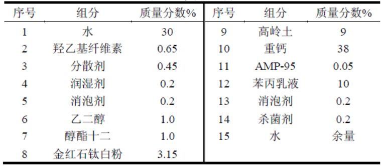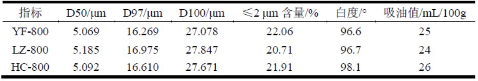 其他原料:分散劑,潤濕劑,消泡劑,乙二醇,醇酯十二,羥乙基纖維素,金紅石型鈦白粉,高嶺土,PH 調(diào)節(jié)劑,苯丙乳液998A,殺菌劑。按實驗配方表所示實驗配方,依次加入組分1-7 首先,轉(zhuǎn)速調(diào)600r/min,分散5 min 后,加入組分8-10,轉(zhuǎn)速調(diào)至1700 r/min,高速分散15 min 后,加入組分12-15,調(diào)低轉(zhuǎn)速至600 r/min,分散5 min 后即完成涂料制備,將其放置在室溫25 ℃的環(huán)境下備用。粘度測試:按GB/T9269-2009 測試;漆膜白度測試:按GB/T1729-1979 測試;對比率測試:按GB/T1726-1979 測試;光澤度測試:按GB/T1743-1979 測試;耐洗刷性能測試:按GB/T9266-2009 測試。2.1 不同原礦加工的重質(zhì)碳酸鈣的物理指標