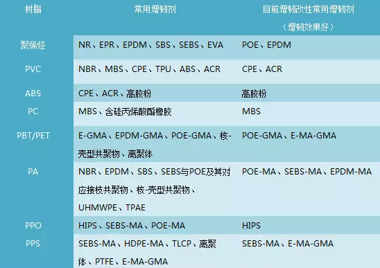 通用塑料一般都是通過自由基加成聚合而得,分子主鏈及側(cè)鏈不含極性基團(tuán),增韌時(shí)添加橡膠粒子及彈性體粒子即可獲得較好的增韌效果;而工程塑料一般是由縮合聚合而得,分子鏈的側(cè)鏈或端基含有極性基團(tuán),增韌時(shí)可通過加入官能團(tuán)化的橡膠或彈性體粒子較高的韌性。