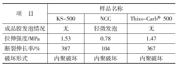 采用KS-500、Thixo-Carb® 500、NCC分別制得的聚氨酯密封膠,其力學(xué)性能檢測(cè)結(jié)果如表4所示。納米碳酸鈣對(duì)密封膠的補(bǔ)強(qiáng)效果主要取決于其晶體形貌、粒徑大小以及與密封膠體系的相容性。從測(cè)試結(jié)果可以看出, KS-500產(chǎn)品與Thixo-Carb® 500產(chǎn)品力學(xué)性能數(shù)據(jù)相差不大,而NCC產(chǎn)品雖然具有較高的比表面積,但在固化過(guò)程中已出現(xiàn)發(fā)泡情況,造成膠體內(nèi)部孔洞較多,力學(xué)性能顯著惡化。