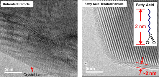 上圖未處理產(chǎn)品和脂肪酸處理產(chǎn)品的粒子表面的透射電子顯微鏡(TEM)圖像。左側(cè)未處理產(chǎn)品中,可以看到粒子的表面附近都有方解石晶格;而右側(cè)脂肪酸處理產(chǎn)品中,由于存在脂肪酸,粒子表面可以觀察到約2nm厚的層狀物質(zhì)。通過(guò)進(jìn)行均質(zhì)的表面處理,可以獲得穩(wěn)定的填料性能。