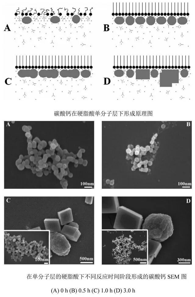 Chen yijian等探究了在空氣-水界面的硬脂酸(SA)單分子層碳酸鈣晶體的形成過程。采用了電子顯微鏡和原位的布儒斯特角顯微鏡進(jìn)行測試表征,觀察到在硬脂酸單分子層下,最終的碳酸鈣晶體是由一種粒子前驅(qū)體形成而不是直接來自于溶劑化的離子。從掃描電子顯微鏡(SEM)和透射電子顯微鏡(TEM)可以發(fā)現(xiàn)這種前驅(qū)體粒子是直徑小于100nm非晶碳酸鈣均勻球體。實(shí)驗(yàn)是通過Ca(OH)2和CO2發(fā)生反應(yīng)生成碳酸鈣,在礦化作用的早期產(chǎn)生了非晶的碳酸鈣,并且至少穩(wěn)定存在0.5h,隨著數(shù)量的增加,非晶的碳酸鈣聚集形成了方解石相的碳酸鈣。