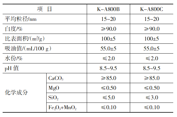 中性硅酮密封膠是以聚二甲基硅氧烷為主要原料,輔以交聯(lián)劑、填料、增塑劑、偶聯(lián)劑、催化劑、色漿等在真空狀態(tài)下混合而成的膏狀物,有多種顏色,常用的顏色有黑色、瓷白、透明、銀灰、灰、古銅等。其中,顏色鮮艷、外觀閃亮的亮黑色膠和閃銀色膠在不銹鋼門(mén)窗等領(lǐng)域備受客戶親睞。中性亮黑硅酮密封膠的填料體系目前主要有3種:一是采用氣相二氧化硅加炭黑色漿;二是直接采用純炭黑;三是在上述兩種配方體系中添加一定比例的納米碳酸鈣以降低生產(chǎn)成本。在此,將最新研發(fā)的、目前市場(chǎng)上粒徑最小的納米碳酸鈣K-A800與氣相二氧化硅進(jìn)行對(duì)比,探討了在中性亮黑硅酮密封膠應(yīng)用領(lǐng)域納米碳酸鈣替代氣相二氧化硅的可行性與經(jīng)濟(jì)性。 氣相二氧化硅是亮黑硅酮密封膠最常用的一種填料,其補(bǔ)強(qiáng)作用受粒徑、比表面積和結(jié)構(gòu)的影響,一般是粒徑越小,比表面積越大,結(jié)構(gòu)越規(guī)整,補(bǔ)強(qiáng)效果越好,所制得的密封膠的強(qiáng)度和硬度越高。目前市面上常見(jiàn)的氣相二氧化硅用于中性亮黑硅酮密封膠存在的最主要的問(wèn)題是分散困難,同時(shí)價(jià)格昂貴。 粒徑在5~20 nm之間的納米碳酸鈣,對(duì)硅酮密封膠的補(bǔ)強(qiáng)效果與氣相二氧化硅相當(dāng),可以部分或大部分替代價(jià)格昂貴的碳黑和氣相二氧化硅。但是,目前國(guó)內(nèi)的納米碳酸鈣質(zhì)量參差不齊,尤其是在晶體生長(zhǎng)控制技術(shù)方面,真正能實(shí)現(xiàn)晶體規(guī)整化預(yù)期生長(zhǎng)的產(chǎn)品更是鳳毛麟角。常規(guī)的納米碳酸鈣產(chǎn)品由于晶體形態(tài)和粒徑的限制,會(huì)顯著降低色漿的使用效果,無(wú)法應(yīng)用在中性亮黑硅酮密封膠中。 納米碳酸鈣K-A800是一種高端納米碳酸鈣產(chǎn)品,立方體晶型,平均一次粒徑為15~20 nm,比表面積為(100±5) m2/g,具有晶體規(guī)整、粒徑小且分布均勻、比表面積高、分散性好等優(yōu)點(diǎn),為目前市場(chǎng)上粒徑最小的納米碳酸鈣。納米碳酸鈣K-A800的晶體特性見(jiàn)表1,產(chǎn)品主要性能指標(biāo)見(jiàn)表2。