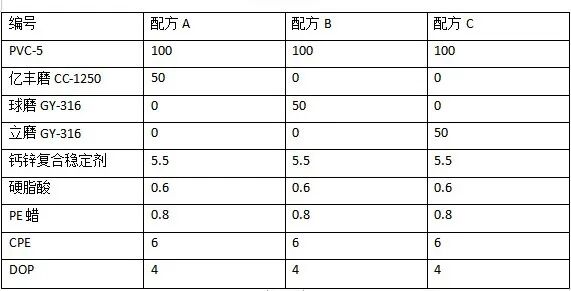 為了解不同工藝生產(chǎn)的碳酸鈣對PVC板材各性能的影響,實驗根據(jù)PVC板材市場常用的碳酸鈣以1250目為基準(zhǔn),采用不同工藝生產(chǎn)(億豐磨、球磨、立磨)碳酸鈣進行實驗測試對比。