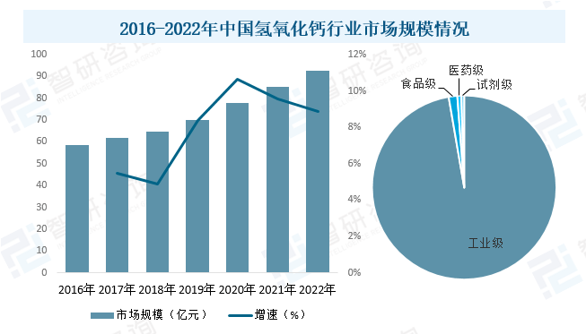 在我國(guó)氫氧化鈣行業(yè)快速發(fā)展及行業(yè)下游需求持續(xù)增長(zhǎng)的推動(dòng)下,近年來(lái)我國(guó)氫氧化鈣行業(yè)市場(chǎng)規(guī)模持續(xù)擴(kuò)張。據(jù)資料顯示,2021年我國(guó)氫氧化鈣行業(yè)市場(chǎng)規(guī)模為84.99億元,同比增長(zhǎng)9.5%,2022年行業(yè)市場(chǎng)規(guī)模約為92.53億元,同比增長(zhǎng)8.9%。其中工業(yè)級(jí)氫氧化鈣占比是最主要的細(xì)分市場(chǎng),占比約為97.3%,食品級(jí)、醫(yī)藥級(jí)和試劑級(jí)占比分別為1.5%、0.7%和0.5%。
