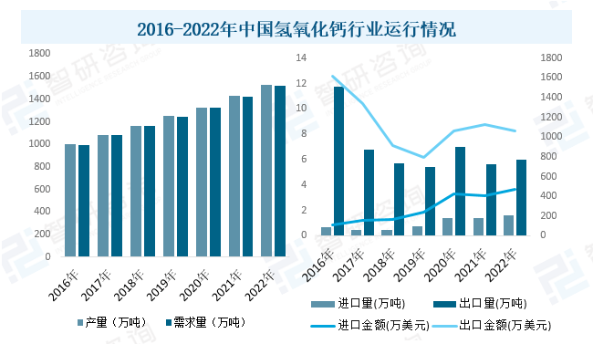 從行業(yè)供需方面來(lái)看,近年來(lái),我國(guó)氫氧化鈣產(chǎn)量及需求量持續(xù)增長(zhǎng),2021年我國(guó)氫氧化鈣產(chǎn)量為1427.3萬(wàn)噸,同比增長(zhǎng)7.4%,需求量為1422.9萬(wàn)噸,同比增長(zhǎng)7.5%;到2022年我國(guó)氫氧化鈣產(chǎn)量約為1524.4萬(wàn)噸,同比增長(zhǎng)6.8%,需求量約為1520萬(wàn)噸,同比增長(zhǎng)6.8%。