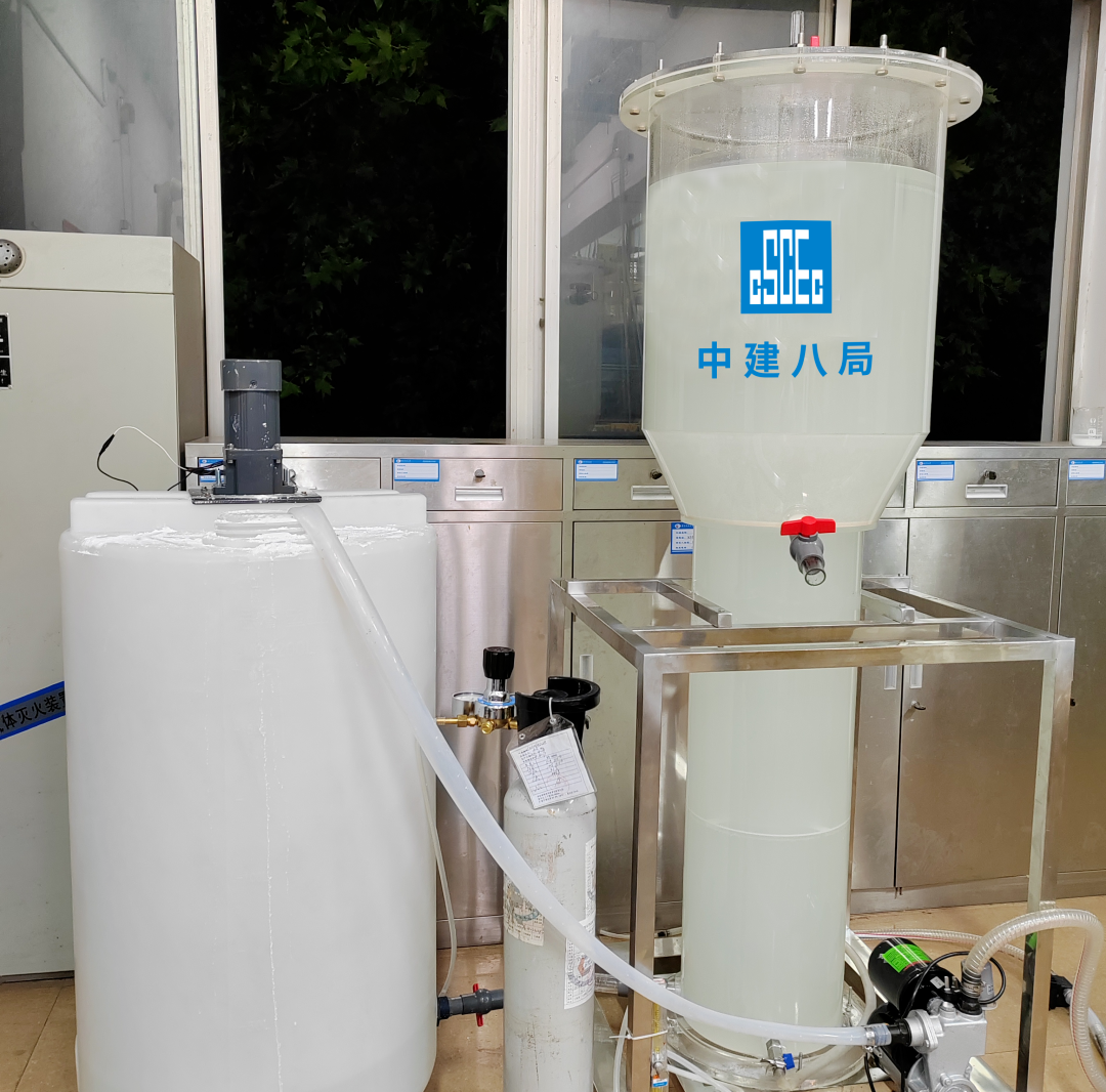 中建八局低能耗碳捕集與利用裝置包括挖掘機尾氣礦化利用裝置、燃氣鍋爐煙氣礦化利用裝置,通過溶液流量和pH傳感器監(jiān)測和反饋控制,實現(xiàn)系統(tǒng)的自動化運行。
