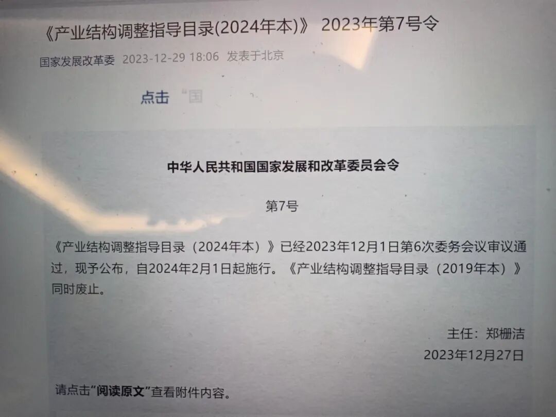 12月29日,國家發(fā)改委主任鄭柵潔簽署第7號令,《產(chǎn)業(yè)結(jié)構(gòu)調(diào)整指導(dǎo)目錄(2024年本)》已經(jīng)2023年12月1日第6次委務(wù)會議審議通過,予以公布,自2024年2月1日起施行,《產(chǎn)業(yè)結(jié)構(gòu)調(diào)整指導(dǎo)目錄(2019年本)》同時廢止。